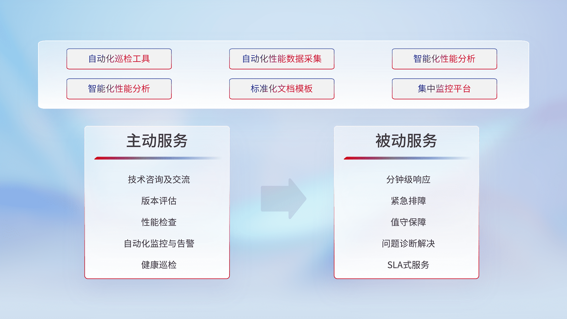 智能化工具和标准化文档,,,保障服务质量,,,提供主动服务(包含技术咨询、、、、版本评估、、、性能检查、、、、自动化监控与告警、、、健康巡检)和被动服务包含(分钟级响应、、紧急排障、、值守保障、、问题诊断解决、、、SLA服务)。。